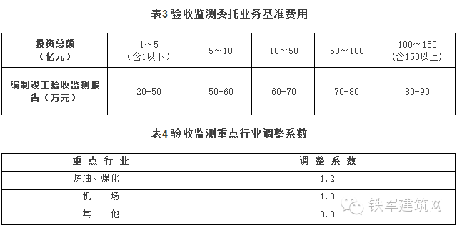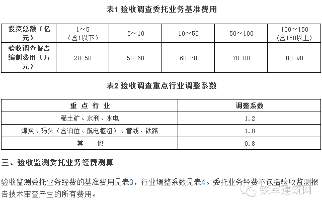 验收调查委托业务经费的基准费用见表1,行业调整系数见表2。委托业务经费不包括验收调查报告技术审查产生的所有费用。